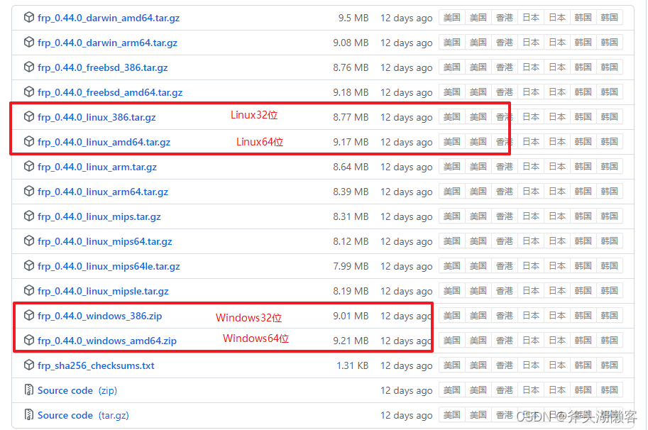 准备一个阿里云服务器,准备安装frp服务端,准备一台电脑安装frp客户端。所以这里需要下载Linux版本和windows版本