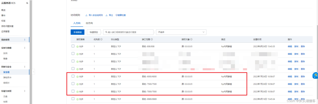 阿里云服务器端口是没有开放的,所以我们需要先在阿里云安全组中开放7000(frp客户端和服务端通信端口),6000(服务器端要监听的端口),7500(这是frp面板的端口,下面会提到)这三个端口。