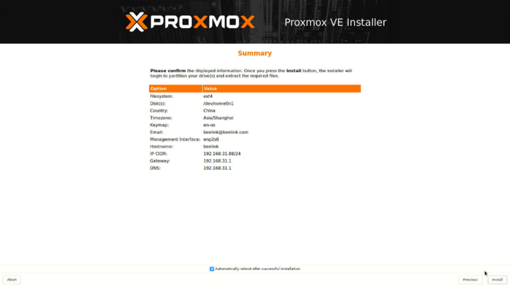 13.确认PVE系统安装信息无误后,点击【Install】按钮进行系统安装