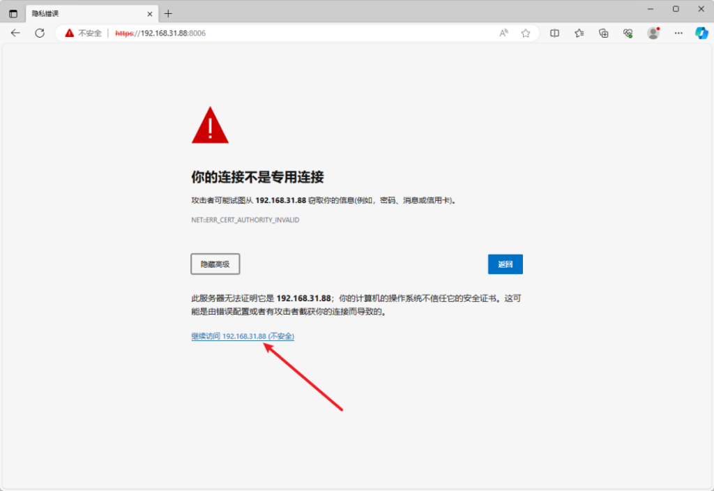 16.浏览器可能会弹出隐私错误的提示,点击【高级】,选择【继续访问】即可